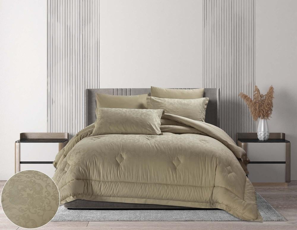 اغمر نفسك في راحة فاخرة وأناقة هادئة مع طقم لحاف كانون المتكامل. يجمع بين الجودة الاستثنائية والتصميم الجذاب ليضيف لمسة من الرقي والدفء لغرفة نومك.